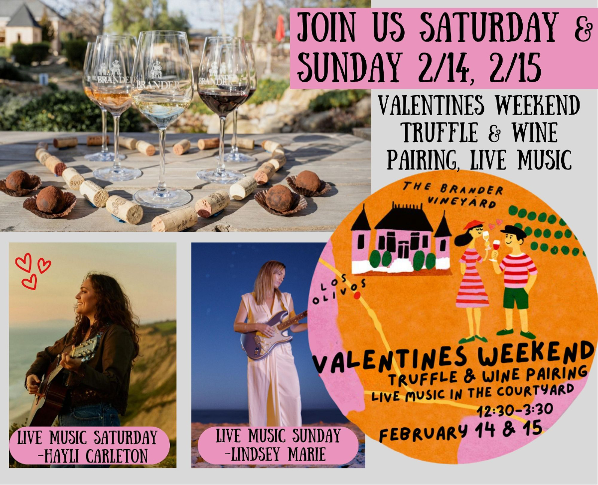 Includes artisan chocolates from Jessica Foster Confections, a flight of five signature Brander wines, and music from Hayli Carleton (Saturday) and Lindsey Marie (Sunday).