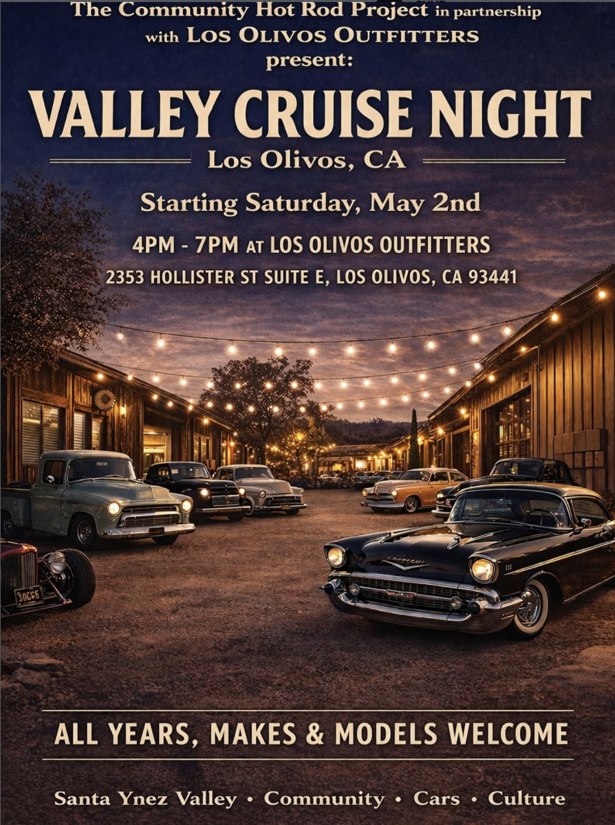 Food, music, beverages. Brought to you by the Community Hot Rod Project. At Los Olivos Outfitters, 2353 Hollister St. in Los Olivos.