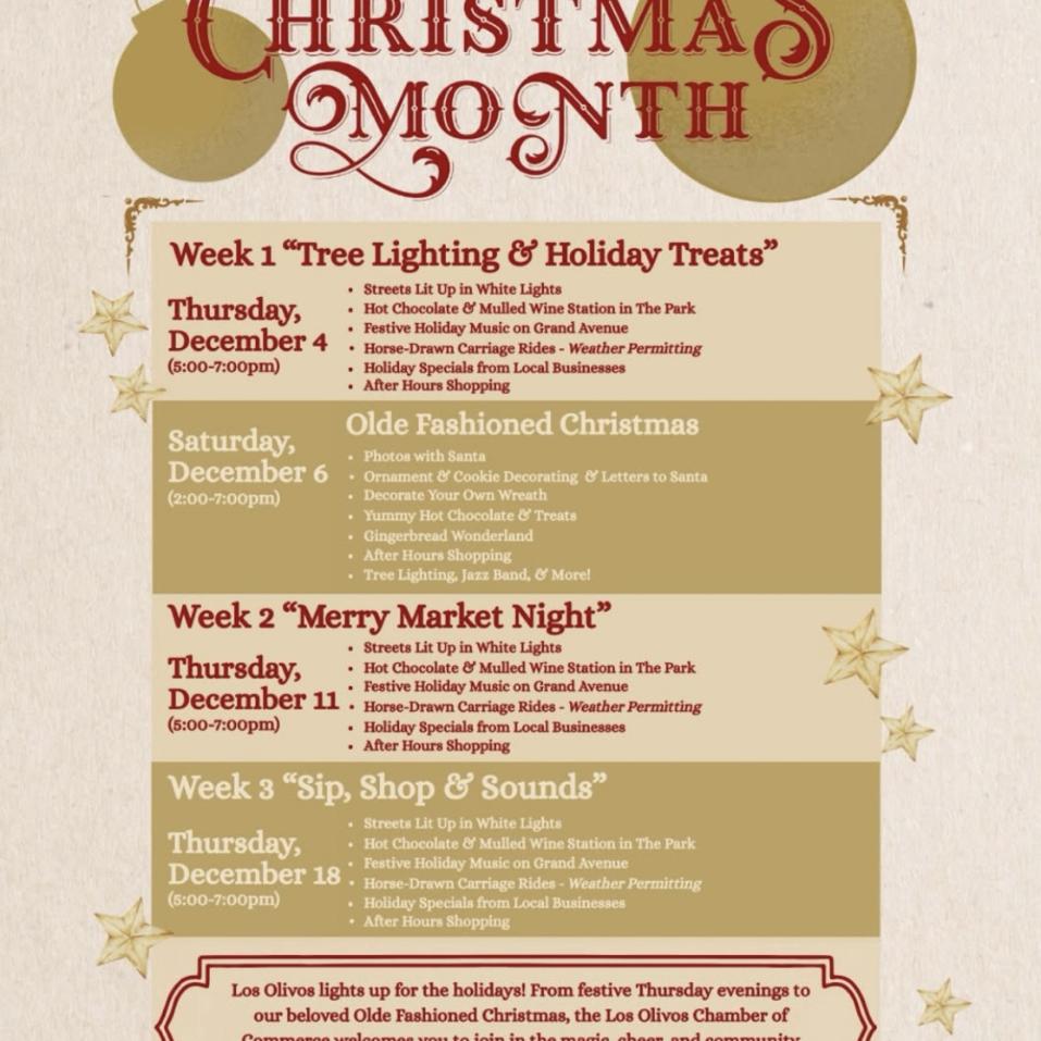 ![]() | Sip, Shop, & Sounds in Los Olivos5 – 7 pmHot chocolate and mulled wine station in the park, holiday music on Grand Ave., horse-drawn carriage rides, and specials and after-hours shopping at local businesses. |